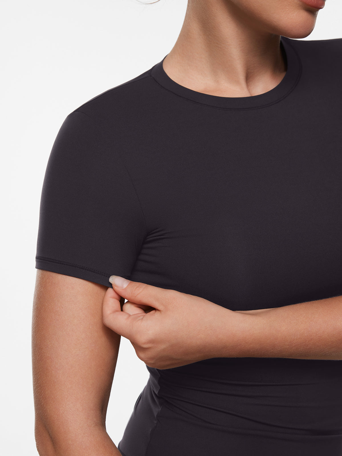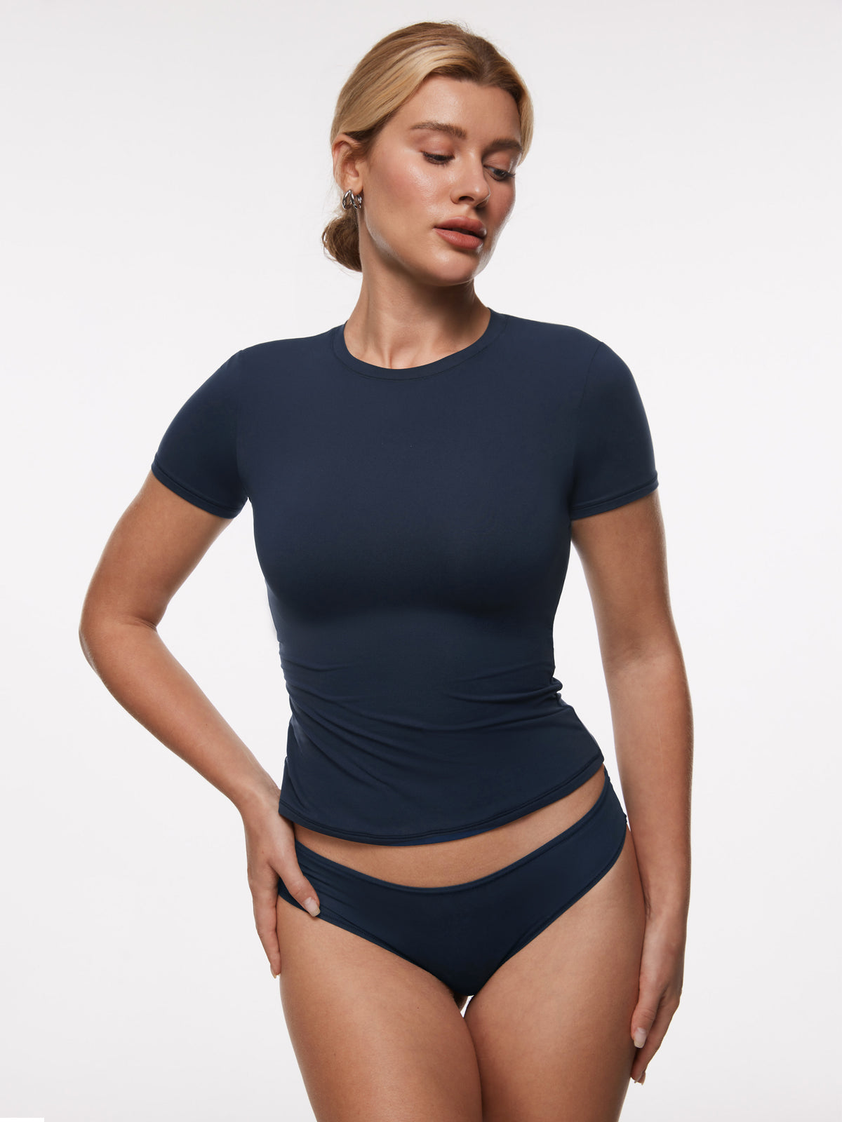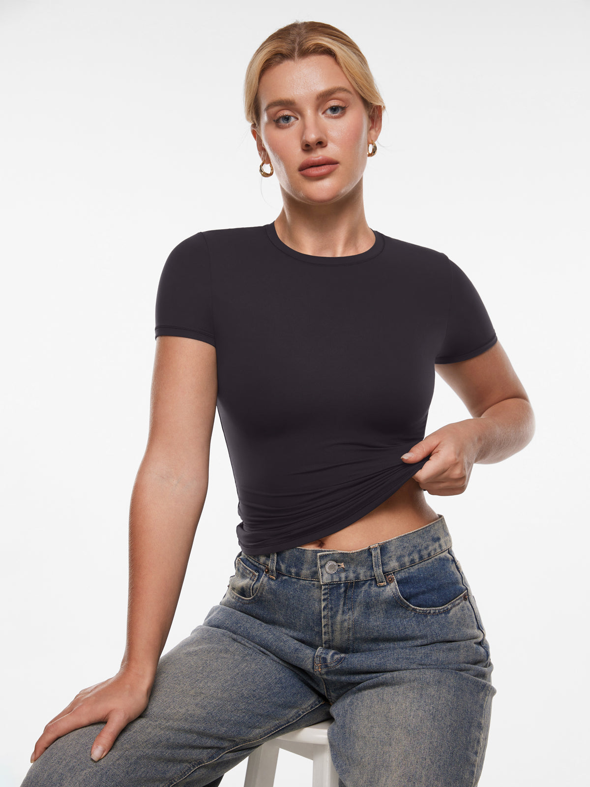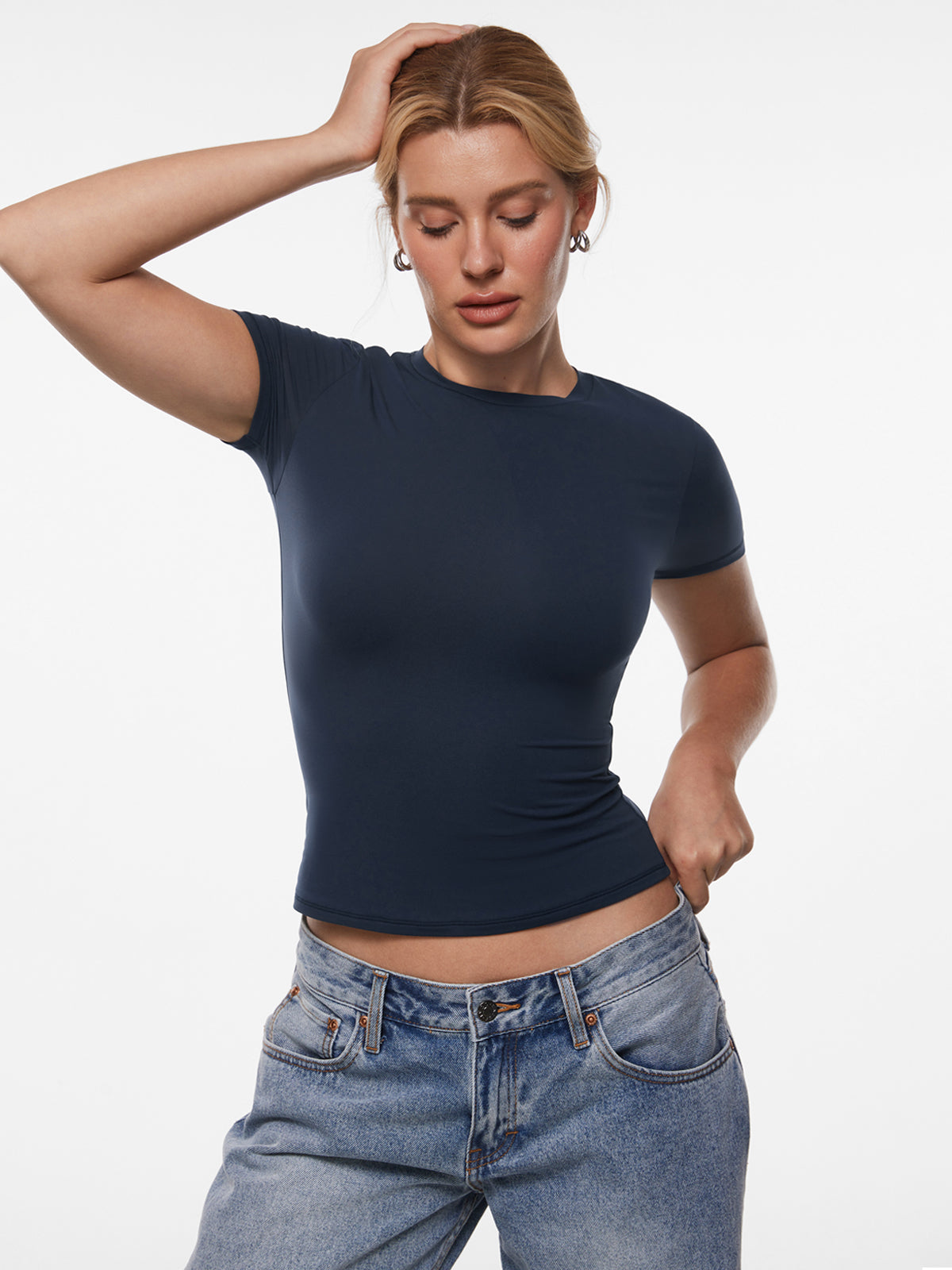 This soft, sleek short-sleeve top combines a breathable double-layer feel with exceptional stretch for ultimate comfort. Its slimming fit offers casual style, perfect for daily wear, workouts, the office, or relaxing at home.