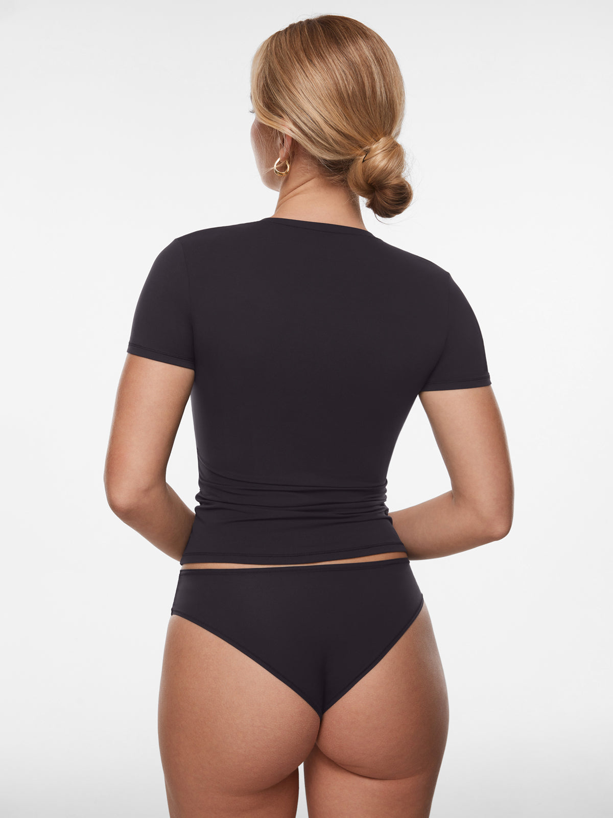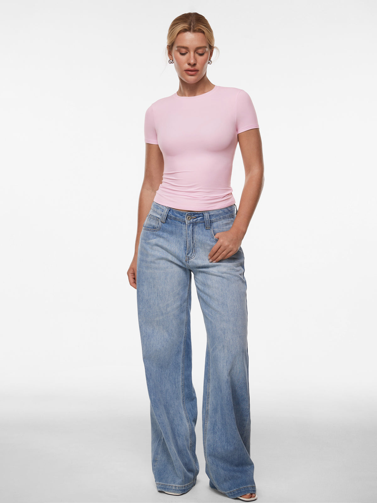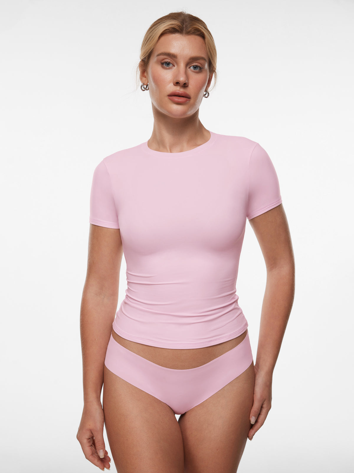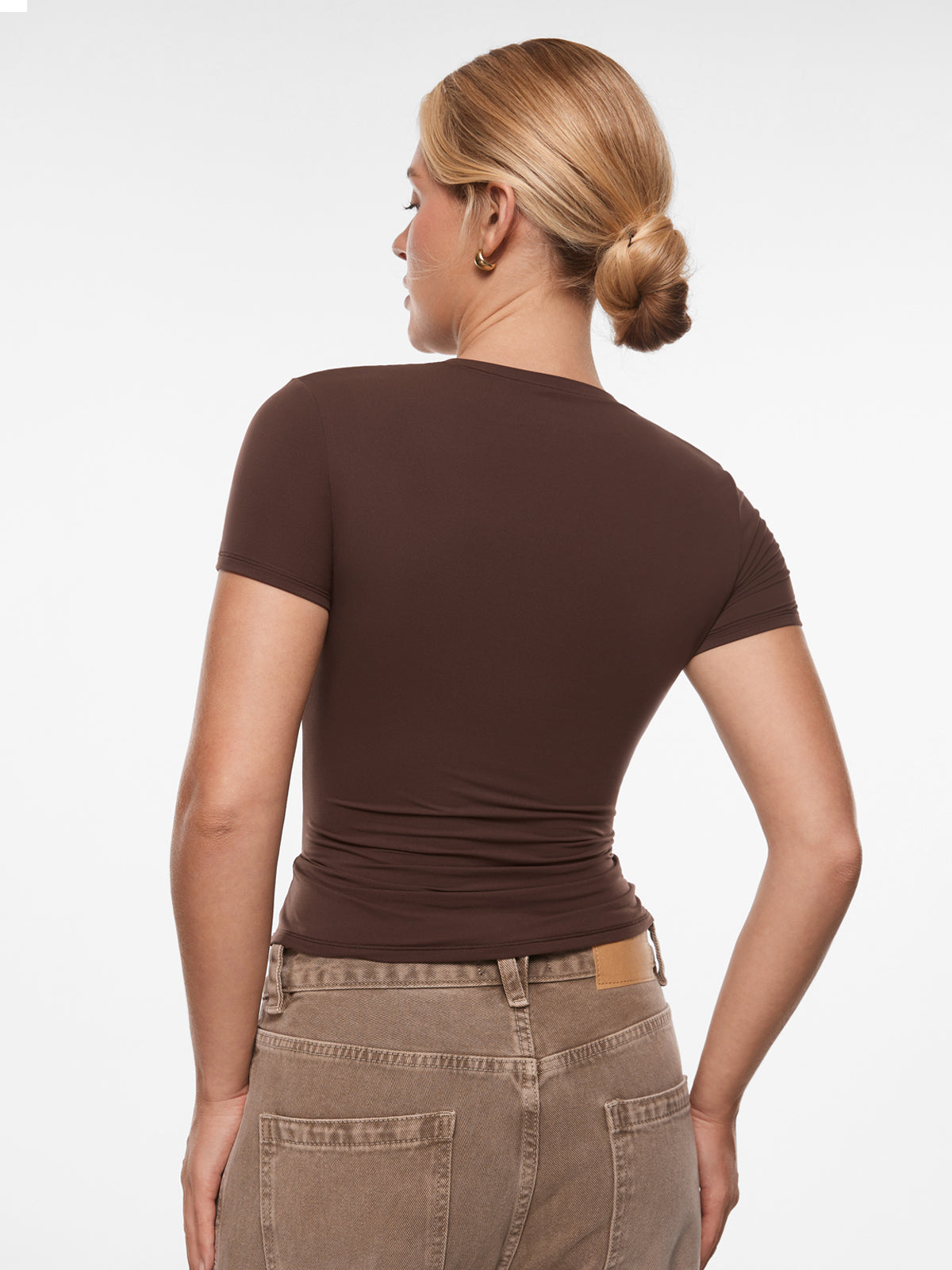 This soft, sleek short-sleeve top combines a breathable double-layer feel with exceptional stretch for ultimate comfort. Its slimming fit offers casual style, perfect for daily wear, workouts, the office, or relaxing at home.