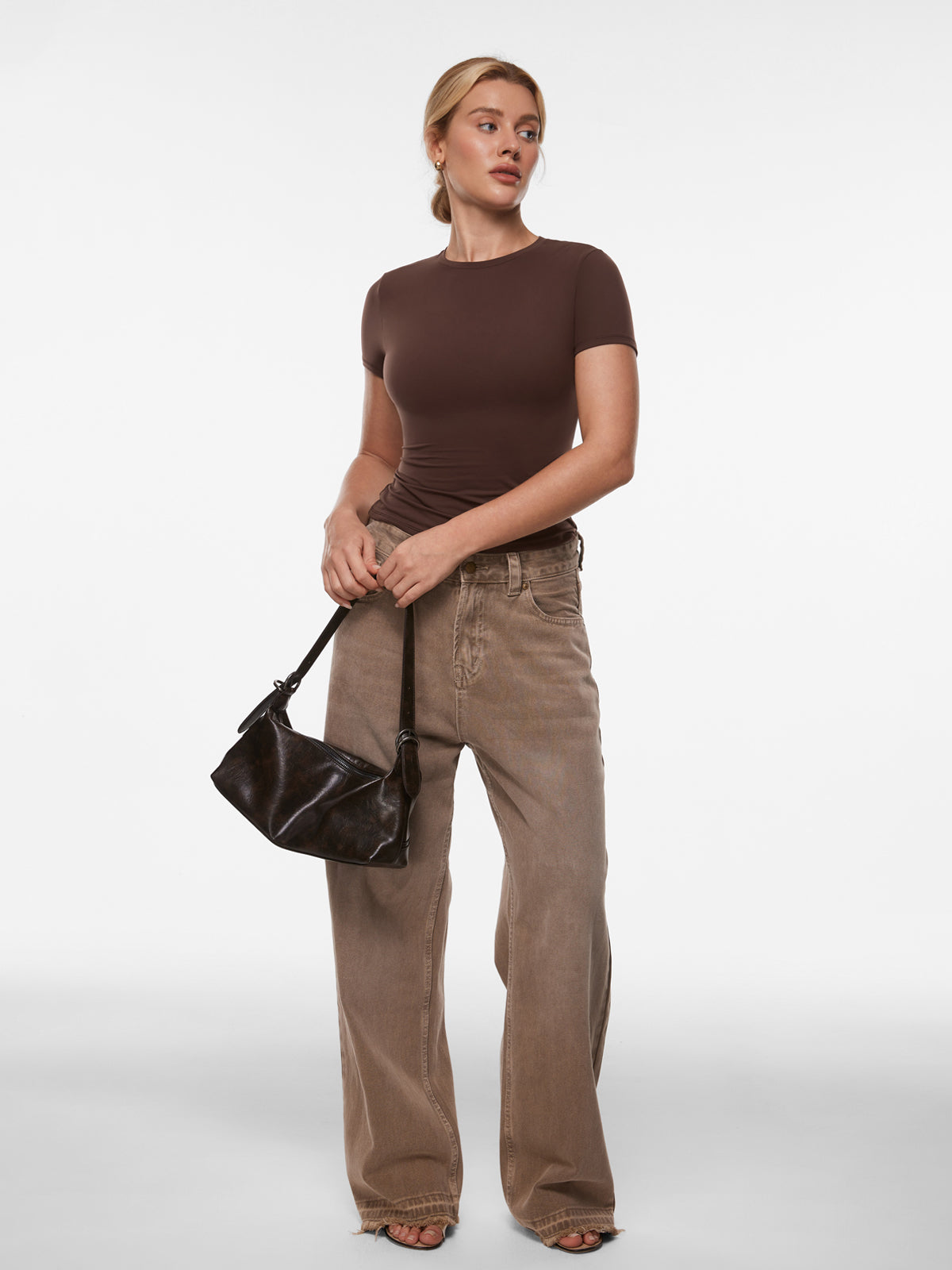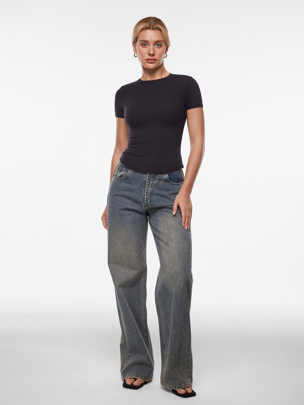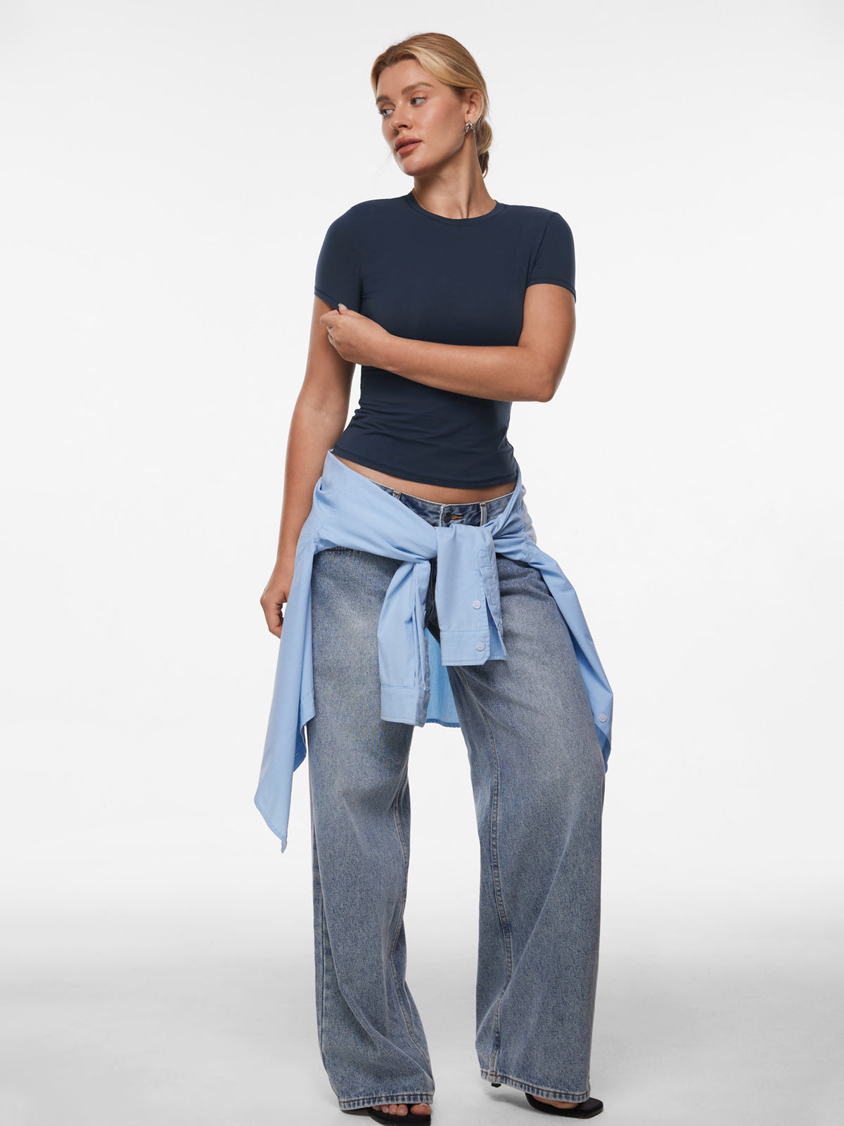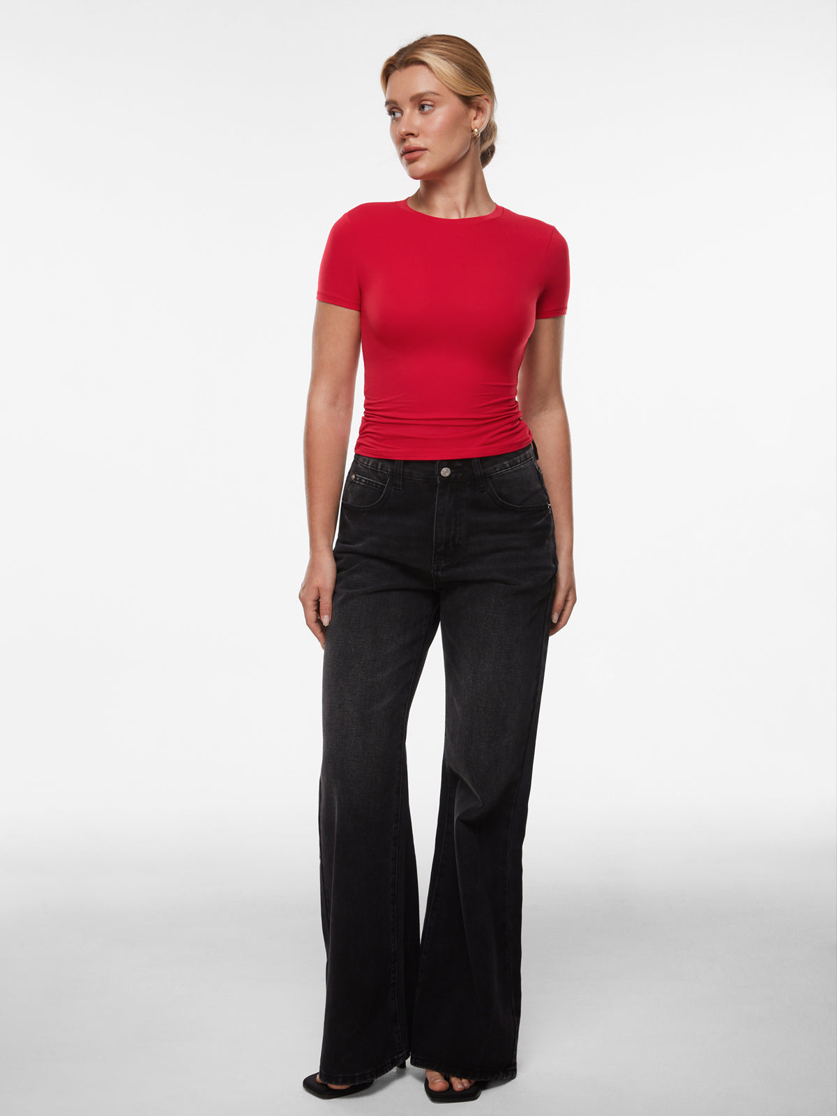 This soft, sleek short-sleeve top combines a breathable double-layer feel with exceptional stretch for ultimate comfort. Its slimming fit offers casual style, perfect for daily wear, workouts, the office, or relaxing at home.